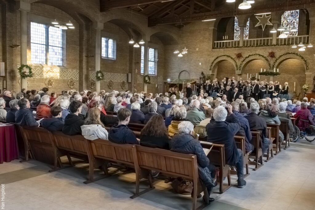 Tijdens Kerstsamenzang in december 2025 stonden we met meer dan 55 koorleden op het podium. Rhythm of Life telt 50 koorleden en Viva vocaal telt in totaal 20 koorleden maar niet alle koorleden waren aanwezig in de R.K. kerk van Nieuw – Vennep. Ons repertoire was veelzijdig. We zongen bijv: Halleluja, Quem pastores, Dona nobis pacem, the Rose en You raise me up. En daarnaast diverse kerstliedjes zoals: Jingle bells, Stille Nacht, een kind geboren in Bethlehem en Kerstwensen. Voorafgaand aan ons optreden heeft het koor uit Haarlem een aantal keren met ons gerepeteerd in Nieuw Vennep. Dit hebben we vorig jaar ook al met elkaar gedaan. Het was erg leuk om elkaar weer te ontmoeten en een optreden te verzorgen in de kerk van Nieuw Vennep. Ons concert was van 15.00u tot 17.00u en in de pauze was er koffie/thee met krentenbrood. Na afloop kon iedereen nog een drankje drinken in de Herberg naast de kerk. Het was een groot succes. Zie foto’s.